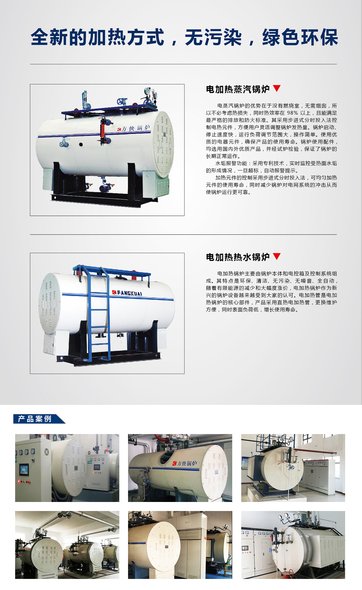 方快电蒸汽锅炉系列采用全自动运行模式,锅炉主要由供水系统、自控系统、炉胆与加热系统及安全保护系统等共同组成。锅炉使用电力作为发热源,没有燃烧室,无需烟囱,也不必考虑热损失的问题,热效率在98%以上,且能满足最严格的排放和防火标准,极具安全性。其使用步进式分时投入法控制电热元件,方便用户灵活调整锅炉发热量。锅炉启动、停止速度快,运行负荷调节范围大,操作简单方便。